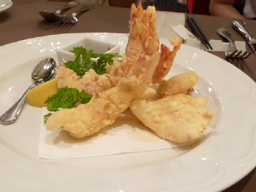 次は 魚介のフリット。パスタで有名なセモリナ粉が使われているんだそうです。海老、帆立、白身魚のフリットです。熱々に レモンを絞って 頂きます。バルサミコ酢とオリーブオイルのソースを つけることも出来ますよ。熱々は ほんと 美味しい。海老は 弾力があって いい素材を 使っているのが 分かります。