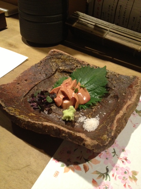 評判の 白レバーの刺身。う~ん濃厚。新鮮そのものですね~口の中でトロリと溶けます。