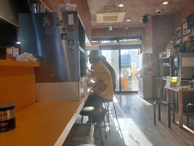 入口のガラス越しに朝日がガンガン差し込んで日差しが直撃。まぶしいけど、暖かさも相まっていいかも。お天道さまを浴びながら二郎を食えるなんて、なんだか縁起まで良く感じる。