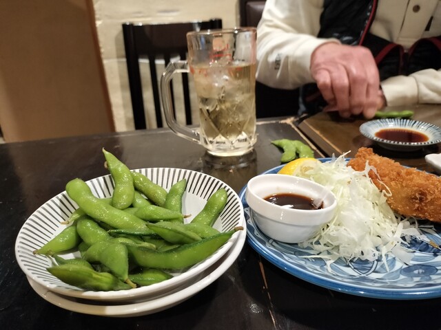 乾杯の音頭とともに、テーブルの上はごちそう祭り!寿司盛り合わせに、おまかせ串の本気盛り、手羽ぎょうざに串揚げ、カキフライ、そして枝豆など、酒の友代表のオールスター戦。
