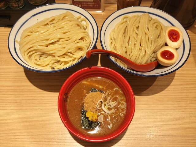 つけ汁は、濃度の高い魚介系の旨みがガツンと効いた王道の味。麺に絡みすぎるくらい、しっかりとまとわりついてくる。
