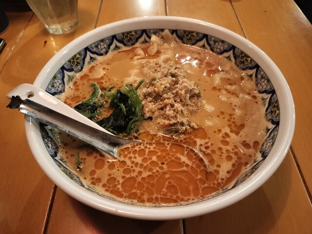 注文して3分程で着丼 早い タンタン麺は見た目はシンプルであり「これぞ基本、これぞ王道」という佇まい。スープは2辛。優しい辛さで、辛いの苦手な人でもいけるタイプ。でも食べ進めるとちゃんと汗が出てくる。深みもあって、これはうまい!刀削麺は幅広・太め・やや固めで大好きな食感。麺はこれ一択でしょ、文句なし!
