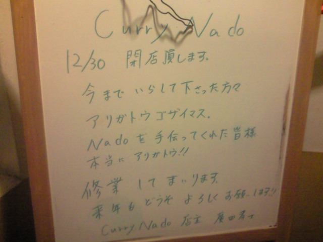 しかし、カレーナドの方は、僕が今月17日に訪問すると、何と昨年12月30日をもって閉店しました、とのこと。