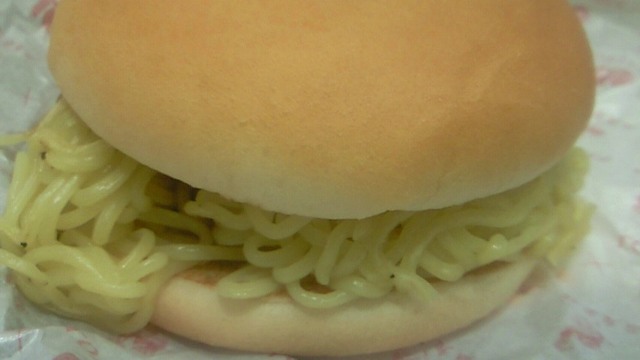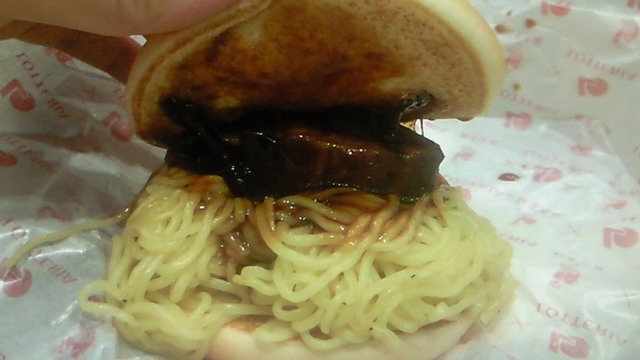 ハンバーガーの中に入っているのはラーメンと、豚の角煮。