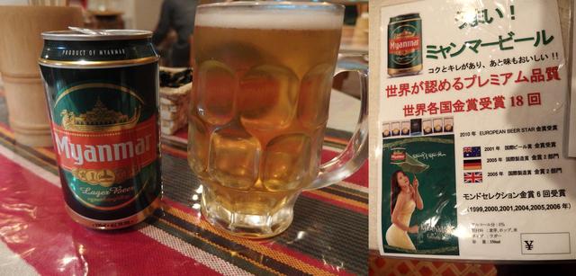 ミャンマービール\500。麦のコクがあり、喉越しもよく、飲みやすく料理にも合う