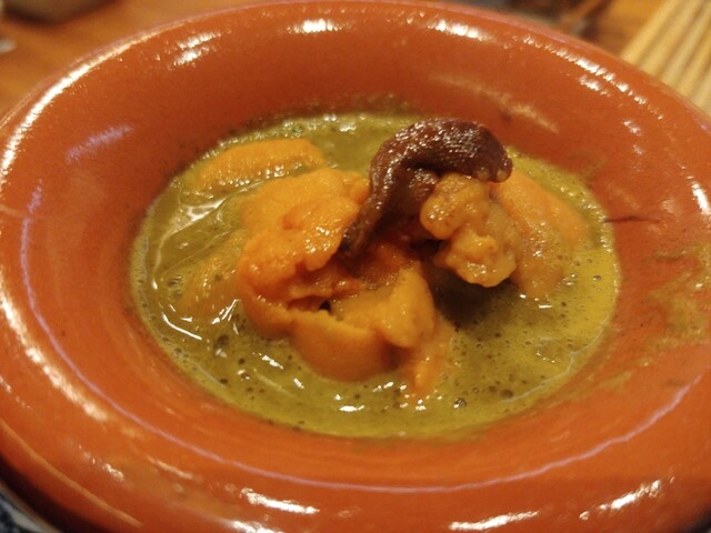 アワビ(ライスボール天、雲丹を添えてぬ)
