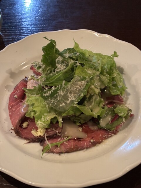 2️⃣サラダ。葉野菜の下にはたっぷりの牛肉。サッパリな味付けでモリモリ食べられる。