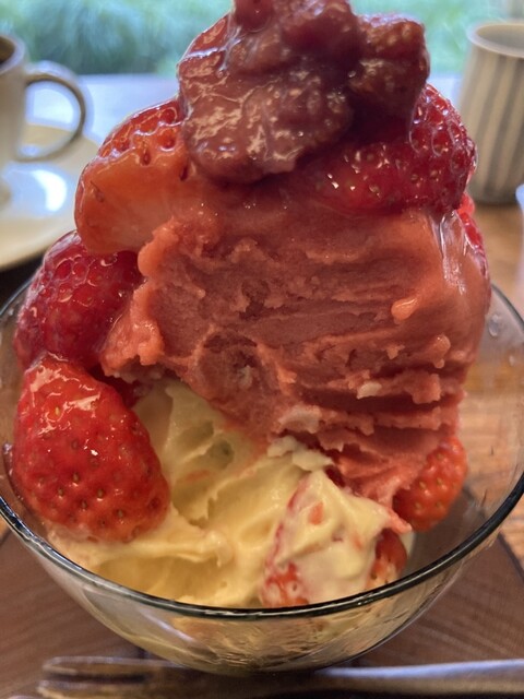 エーイ とパフェと珈琲を。季節限定いちごパフェ。苺もソルベもアイスクリームも美味し〜