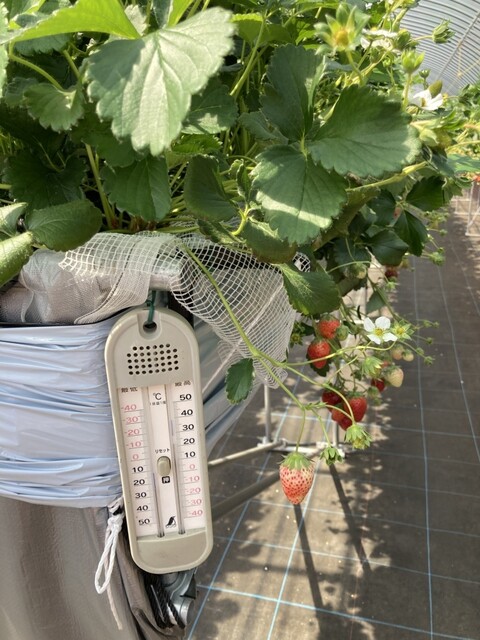 2品種の苺が3列。床高栽培で立ったまま取れます。大きな苺がいっぱい。赤い果実がたくさんあるのを見るだけで