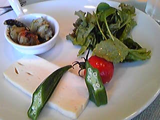 シェフの気まぐれオードブルサラダと言うことで、サラダとバジルやオリーブオイルなどで味付けられた貝(名前忘れた;)と魚系のものと何か(また忘れた;)を練ったものが出てきました。忘れ過ぎですね…スミマセン。