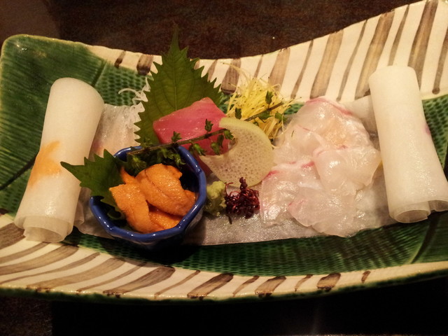 お刺身もりあわせ。トロに、雲丹に、鯛。ぴっちぴちだね~