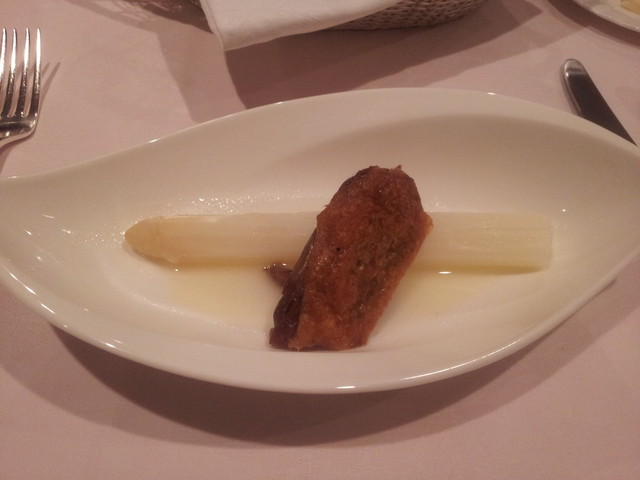 フランス鴨のコンフィ ホワイトアスパラ添え。コンフィ、皮がパリパリ♪