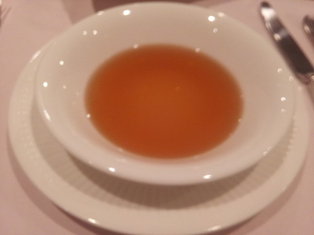 コンソメスープ。いい味がします、最後の1滴まで大事にいただきました。