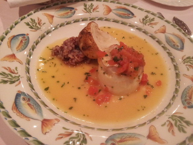 甘鯛の白エビムース詰め、松茸添え、赤米のリゾット。白エビのムースはなめらかで絶品♪