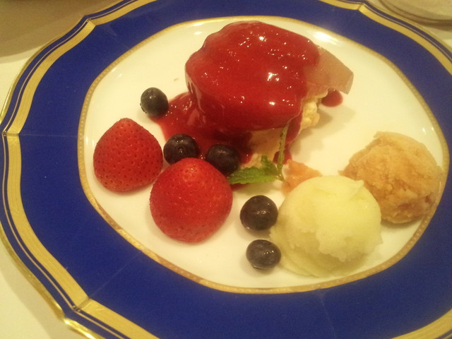 紅茶のシフォンの上にバニラビーンズたっぷりのアイス、メロン&紅茶のシャーベット♪木イチゴソース添え