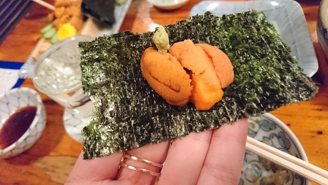 うに刺しや、アサリ酒蒸し、しめさば、唐揚げ、枝豆・・などをいただきました。