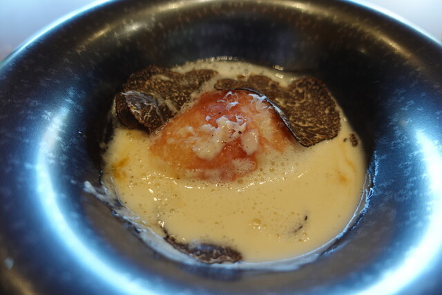 上に薄くスライスされた黒トリュフが飾られている。