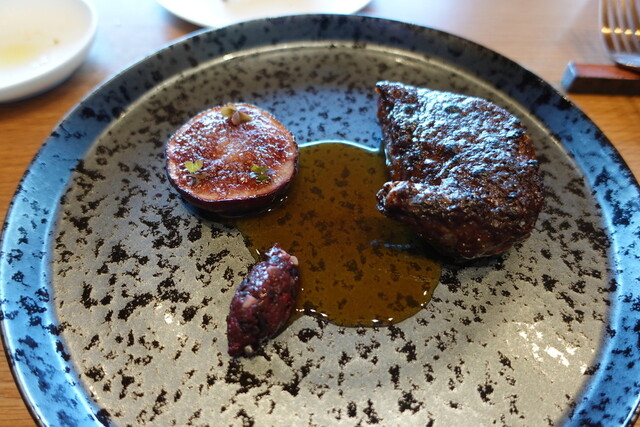 盛り付けもメイン食材、ソース、ガルニで人の顔のようになっているの面白い。