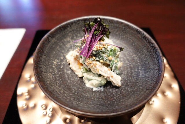 前菜:冬の白和え 春菊、金柑、蓬麩、牛蒡