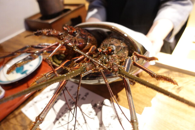 伊勢海老は炭火で軽く炙ってから捌く。海老味噌を絡めて至福の味わい。
