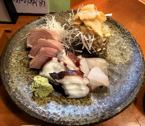 「刺身の盛り合わせ」は、地元の魚介の鮮度が際立つ内容。それぞれに旨みがあり、塩竈らしさを感じる一皿でした。