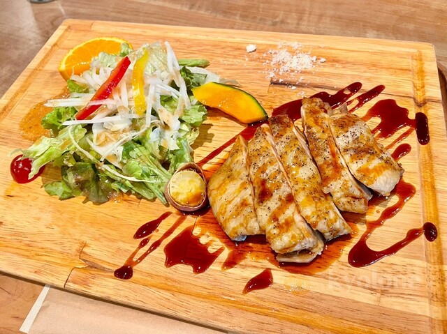 「淡路産の196(いくろー)玉ねぎをオーブンでじっくりとローストして大人気のハンバーグと共にBBQソースをかけました。玉ねぎの甘み、ハンバーグの旨み、BBQソースの燻香、美味しくないわけがない!(当社調べ)」