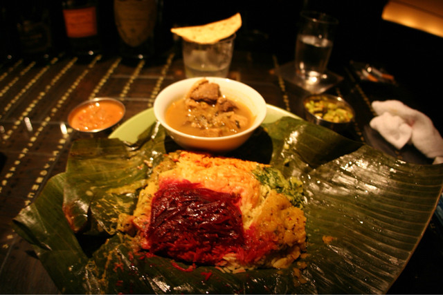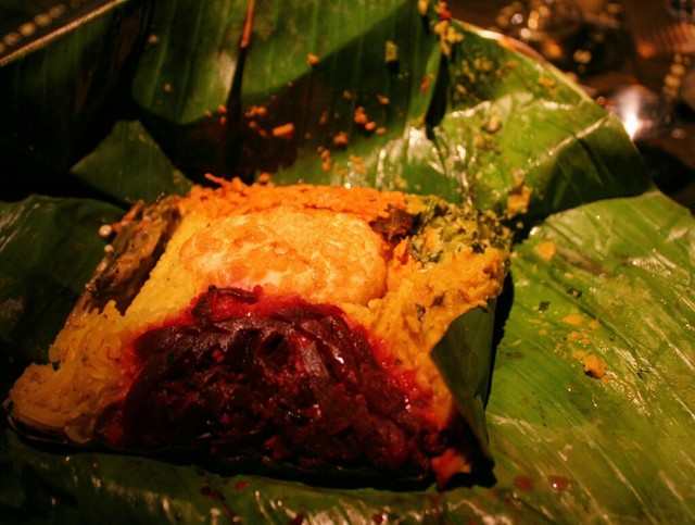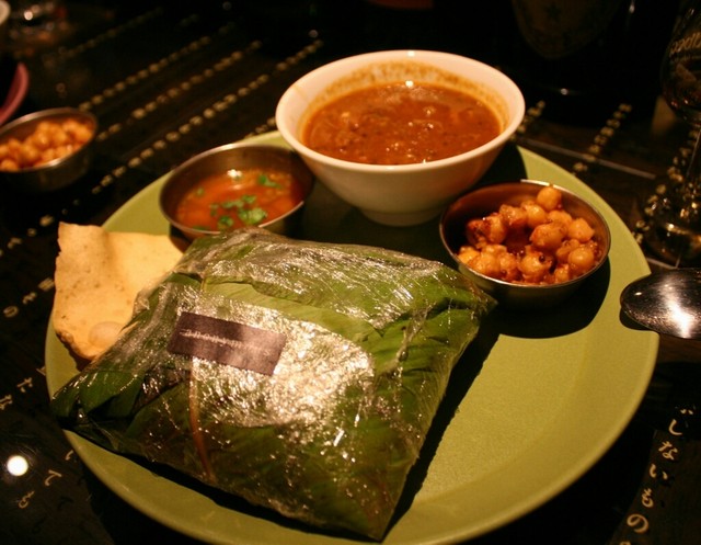 バスマティライスとスパイスで彩られた副菜をバナナの葉で包んだ
