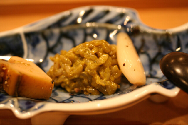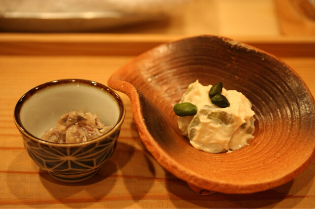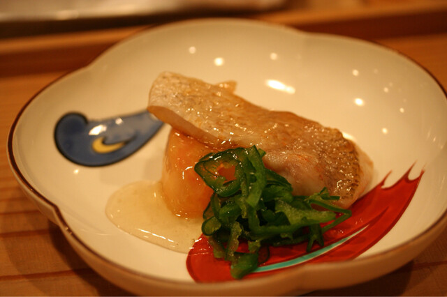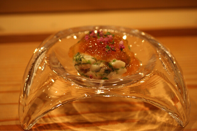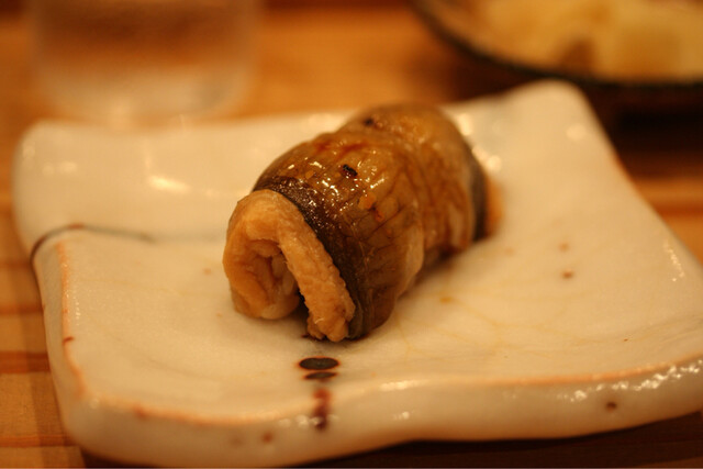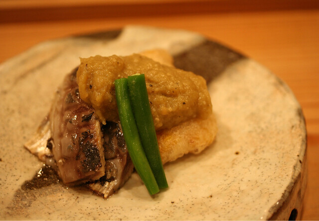 焼き茄子のソースに鰯とトウモロコシのフリットとインゲン