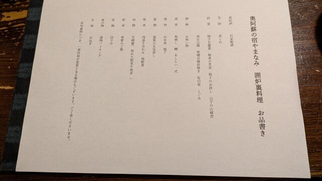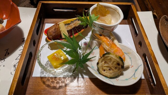 囲炉裏料理、荷物、先付(テーブルセット左)