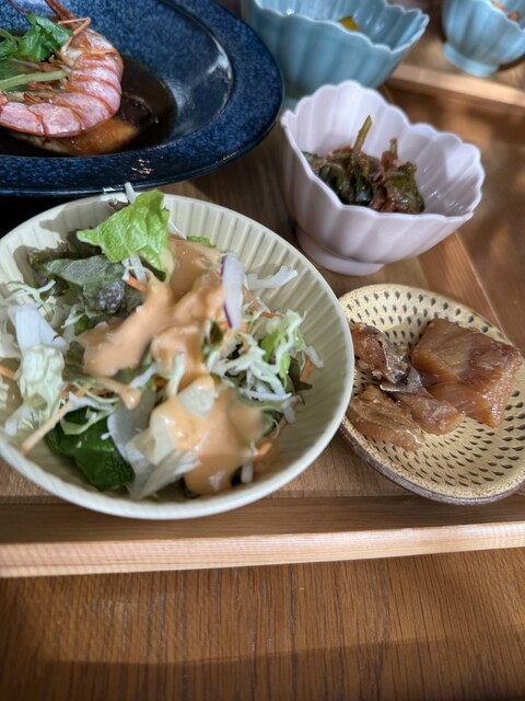 JR宝殿駅と山陽電鉄荒井駅の中間くらいにあるお店、ぎりぎり徒歩圏内かな、歩いていきました。アスパ高砂のある中島の交差点の近くで住宅街の中にあり店舗も住宅のように見えますが、お店の前は転回できるほど広くなっていて駐車場もあるので車でも安心です。「terho(テルホ)気まぐれランチ」のメインは、海老の煮つけと鰤の照り焼き、運よく大好きなメニューでした、かぼちゃなどの煮物小鉢数種にブランドご飯とお味噌汁までついて税込1300円とお得。珈琲もプラス300円で美味しかったです。クラフトコーナーには北欧の可愛い商品が多数あり購入もできます。帰りには正月用のお土産もいただいて店主さんの人柄にもほっこりです。ごちそうさまでした。