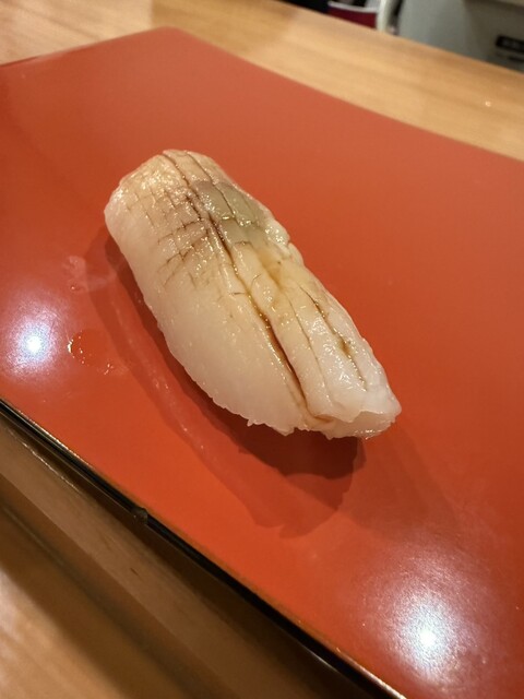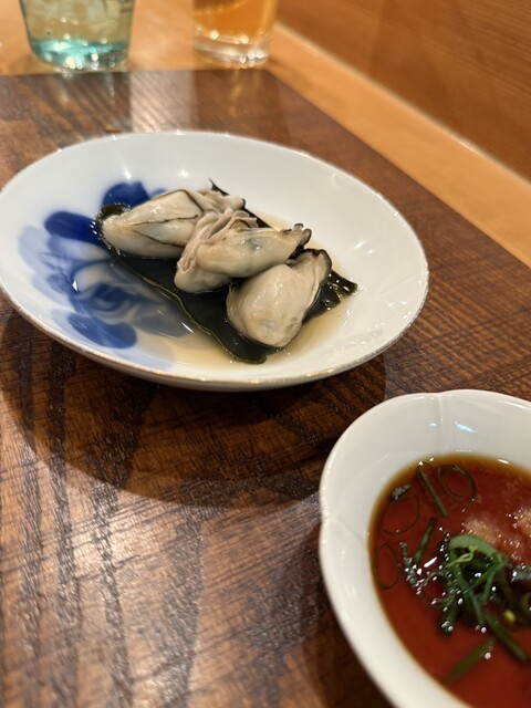 大将と向かい合うカウンタには新鮮な魚や料理に合うお酒がずらり、それらを丁寧な仕事で一品ごとに提供してくれます。最初に苦手なもの(避けてほしい食材)を聞かれて、あとはおまかせで。付きだし、焼き魚、茶碗蒸し、刺身は「かつお、真鯛、あこや貝、蛸、かんぱち」、天ぷらは「めごち」「イワシ」、小鉢は「牡蠣」「蝦蛄」、にぎりは「ひらめ」「いか」「さより」「えび」「タイラギ貝柱」「さわら」「赤身漬け」「蒸し阿穴子」、留め椀、デザートは「いちご」でした。インテリアに阪神タイガースのものがあると思ったら、大将も阪神ファンで会話が盛り上がりました。