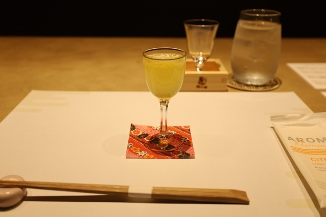 まずは、蜜柑の食前酒で爽やかなひとときを味わいます。