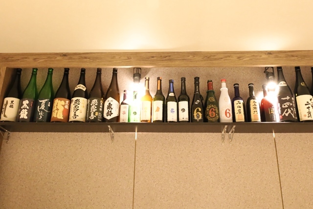店内はカウンター席が12席あり、日本酒がずらりと並んでいます。