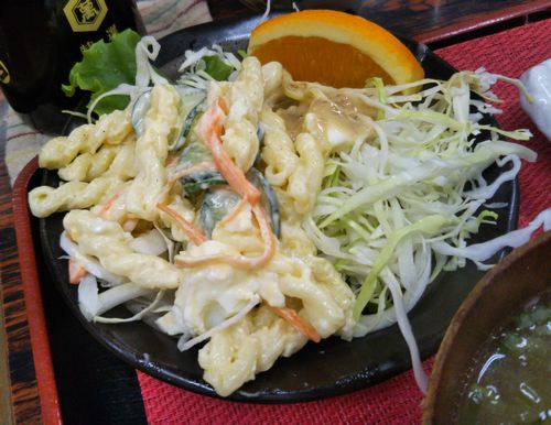 豪快に盛られたサラダ。サラダは八百屋の野菜とは書いてありません。ご飯はおかわり自由です。だし巻き、大根、豆腐。豆腐は豆腐店のモノとの事ですが、小さすぎて違いが解りません。大きかったら違いが解るのかというコメントは受け付けません。