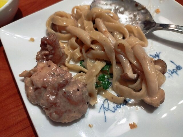 メインが来ました。生麺なんでしょうかね。パンが強烈なので印象が薄いです。ソースは濃いです。