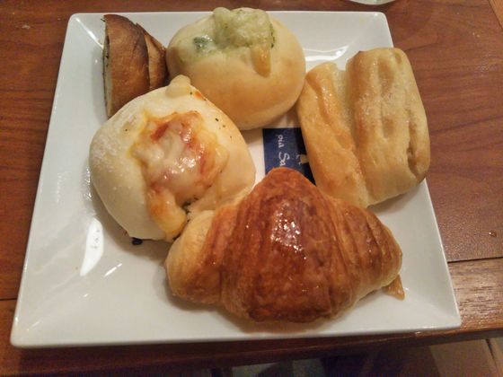 マーガリンとオリーブオイルは無料。前回は具なしパンをたくさん食べたので、大量に消費して足らなくなりましたが、今回は具ありパンをセレクトして店の負担を減らします。