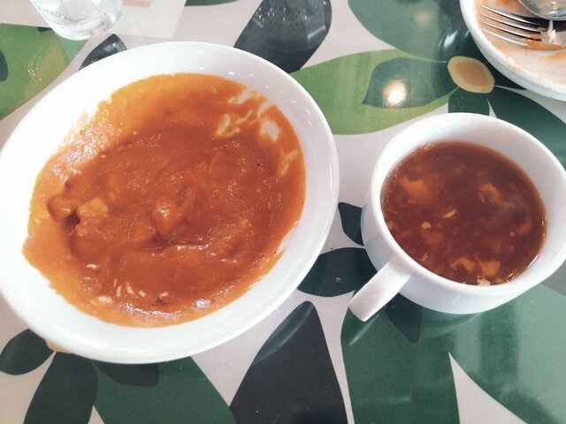 カレーはバターチキンカレーです。思ってたのと違う。トマトシチュー系の味です。酸っぱい。