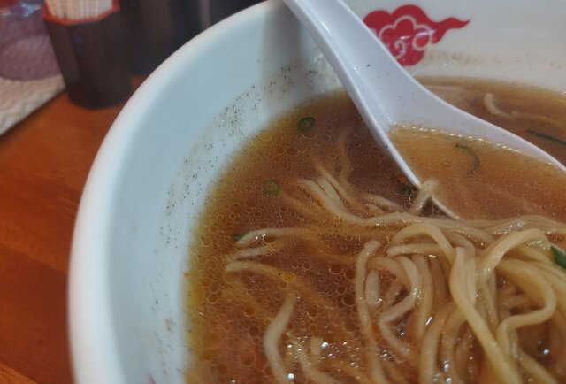 スープの喫水線あたりにアクのようなものが。胡椒なのかな。味にはまったく影響はありません。西宮のどんもこんな粒が丼についてました。