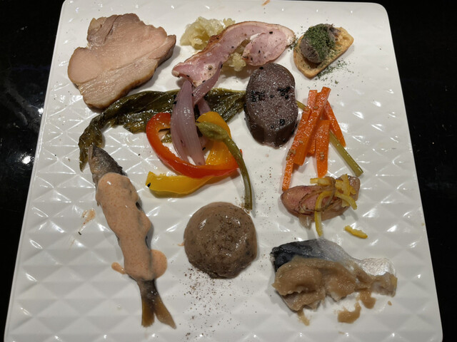 冷製のオードブルは変わらず芸が細かい。白身、赤身、ほたてのムース、鶏、豚、ハム、サラミ、シャンパンピクルス、そして、真ん中はフォアグラのアイス!