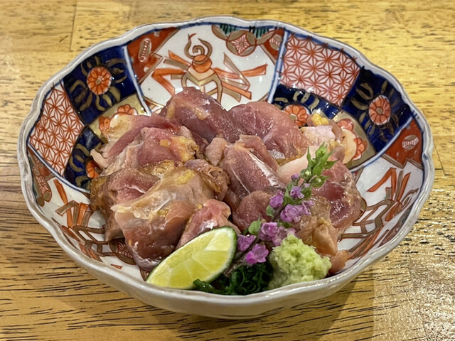 ほたるいかにカラスミのあとは、宮崎の鶏刺し。どれもおいしい。