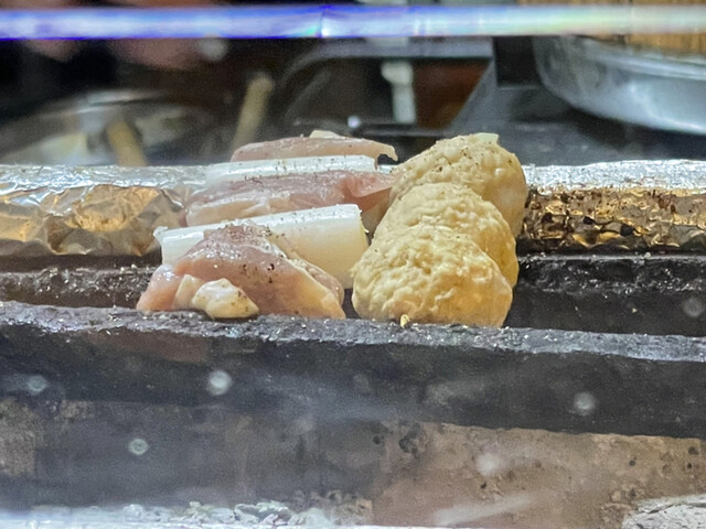 焼き物は、鶏白レバー超レア焼に、栃尾油げ。このレバーは激うま。日本酒ともばっちり。栃尾油げは大きいのでカットして。