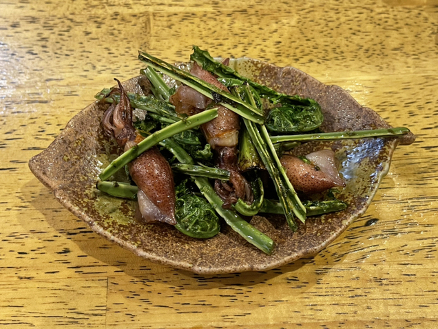 なめろうは、ふきのとうとベストマッチ。ほんのり感じる苦味がいいね。これも山の上の方で採る濃い緑のものが苦味が強くておいしいそうだ。