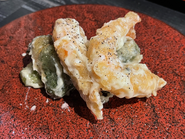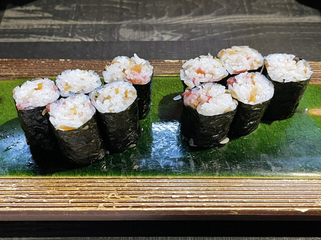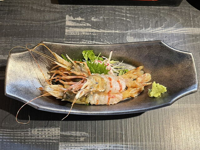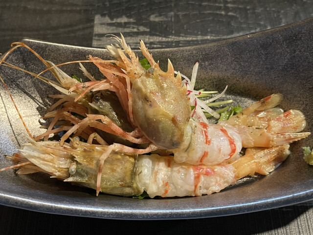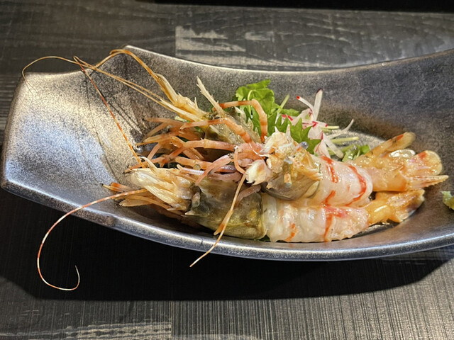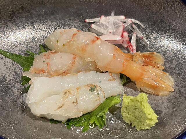 猛者海老と鬼海老の白醤油漬け。メニューでは猛者海老だが、1本鬼海老をまぜてくれた。刺身よりもおいしいかも。