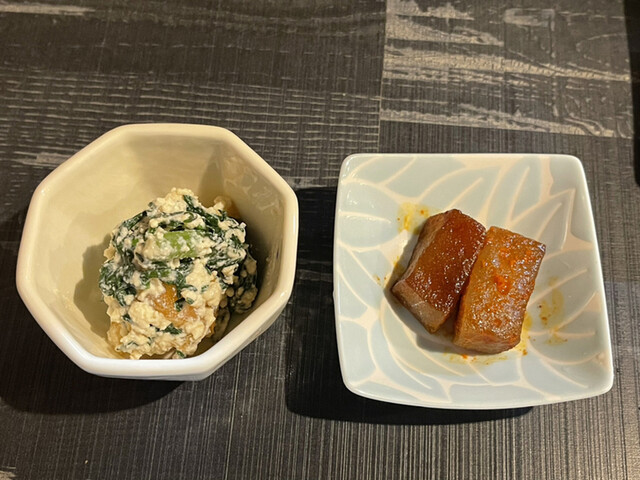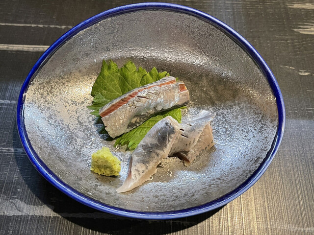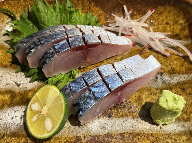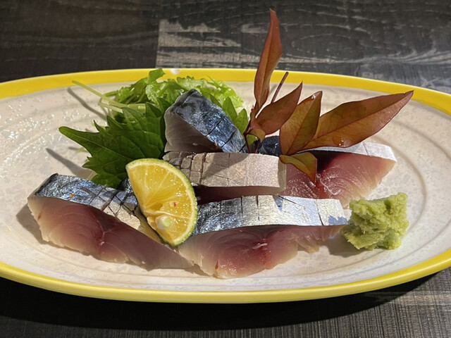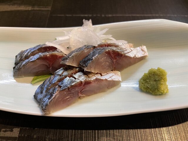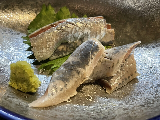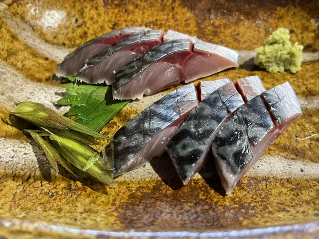 お刺身は、〆さばと鯵のたたきに。煮た者同士だが、こちらの〆さばは、〆具合がちょうどよい。たたきやなめろうもいつもおいしい。