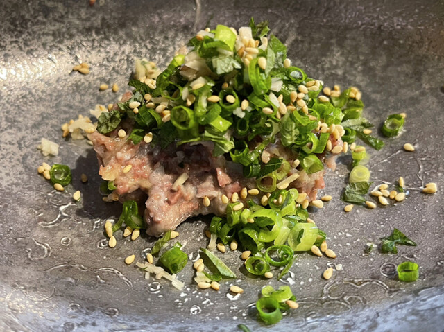 知多ハイに変えて、いわしなめろうを。たたき、なめろうもマスターの十八番で、ちょうどよい塩味と青魚がよく合う。