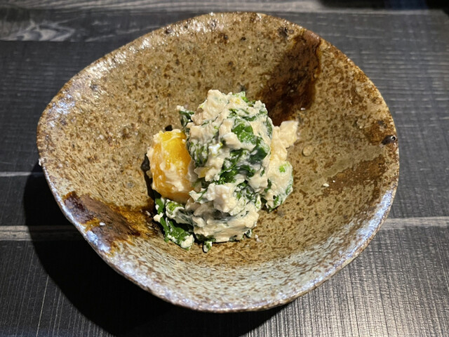 お通しはふきのとうをはさんだトースト。飲み物はいつもの二十世紀梨サワー。