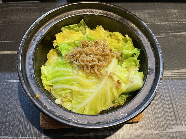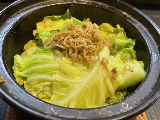 春キャベツ酒蒸しは、タジン鍋で上手にしてあった。ちりめん山椒とキャベツがいい感じにマッチ。