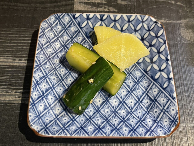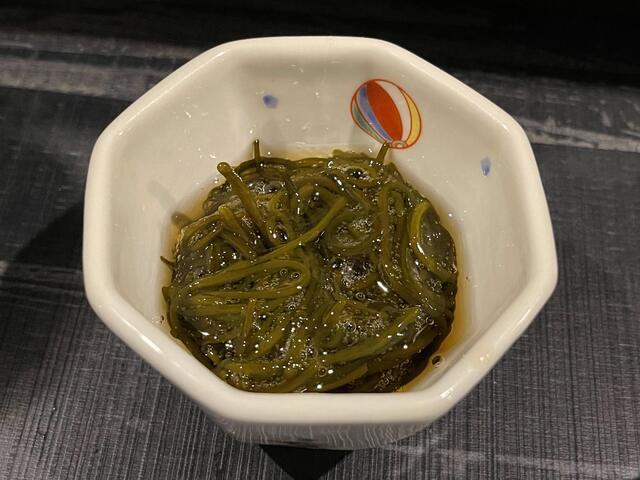 米子 圭蔵へ。二十世紀梨サワーで、お通しは、水だことモロヘイヤ。