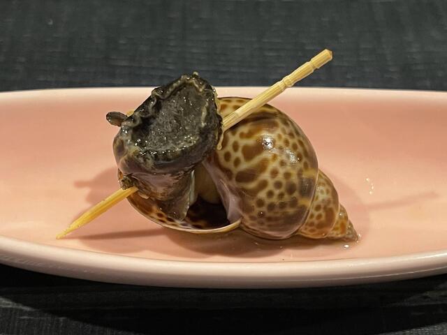 お刺身は、魚でなく、もろげえびと、白ばいを。もろげえびは、刺身でも焼いても揚げてもおいしい。刺身だと殻や頭を食べられないので、ちょっともったいない。