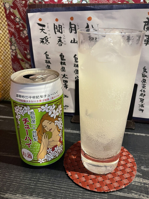 米子 圭蔵へ。二十世紀梨サワーで始める。今日のお通しは、温玉と本バイ。